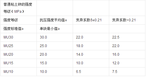 2、強(qiáng)度等級。強(qiáng)度等級根據(jù)10塊磚的抗壓強(qiáng)度平均值、標(biāo)準(zhǔn)值或最小值劃分,共分為MU30、MU25、MU20、MU15、MU10五個(gè)等級,在評定強(qiáng)度等級時(shí),若強(qiáng)度變異系數(shù)δ≤0.21時(shí),采用平均值——標(biāo)準(zhǔn)值方法;若強(qiáng)度變異系數(shù)δ>0.21時(shí),則采用平均值——最小值方法。其具體要求如下表所示。